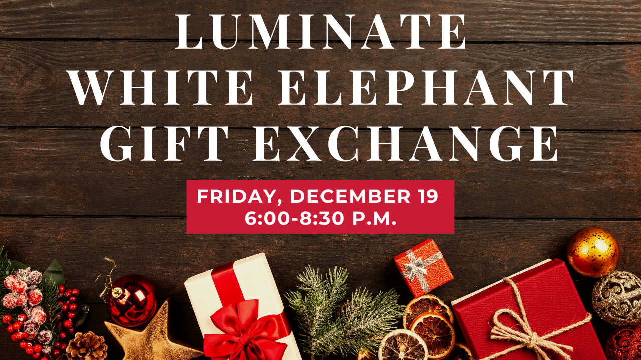 Luminate students, join us in the Youth Room for a fun White Elephant gag gift exchange! For those purchasing gifts, keep the price below $5, but students are welcome to bring an item from home as a gift. Eggnog and dinner will be provided, followed by games and a brief message.